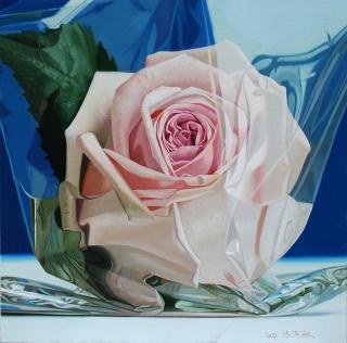 작품의 시그니처인 ‘비닐주머니’는 과일을 품어 투명하게 보여주지만 과일의 생명다움을 억압하여 인간과의 진실한 소통을 방해하는 장막입니다. 오늘날 우리에게 진실은, 화려하고 세련된 포장지(겉모습)에 따라 검증되기 때문에 과육에 담긴 수백 일의 햇살과 바람, 구름의 유희를 우리는 헤아리지 못합니다. ‘날 것’ 그대로의 생명다움을 바로 보기를 원하는 작가의 메시지가 극사실주의적으로 표현된 작품입니다.