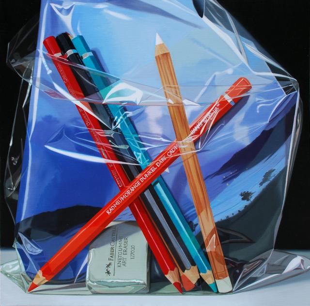 작품의 시그니처인 ‘비닐주머니’는 과일을 품어 투명하게 보여주지만 과일의 생명다움을 억압하여 인간과의 진실한 소통을 방해하는 장막입니다. 오늘날 우리에게 진실은, 화려하고 세련된 포장지(겉모습)에 따라 검증되기 때문에 과육에 담긴 수백 일의 햇살과 바람, 구름의 유희를 우리는 헤아리지 못합니다. ‘날 것’ 그대로의 생명다움을 바로 보기를 원하는 작가의 메시지가 극사실주의적으로 표현된 작품입니다.