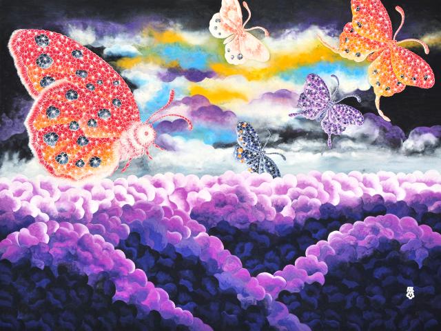 작가는 능소화와 나비를 전통채색방식에 현대적인 조형성으로 표현하여 사랑, 만남, 이별의 여정을 펼칩니다. 능소화는 사랑을 이루지 못한 여인이 상대에 대한 그리움으로 붉게 피어났다는 설화를 가지고 있는데 작품에서도 능소화는 아주 화려하고 만개한 모습으로 등장하고 있어 슬픈 감정을 던져 줍니다. 다양한 색채로 드러나는 나비들은 서로 만나 교감하는 장면과 흩어져서 이별하는 장면으로 묘사되어 삶과 사랑에 대한 작가의 진지한 탐색이 드러납니다.