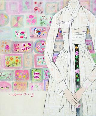 작가는 어머니가 자신을 이름 대신 부르던 ‘가시나’에 대한 그리움과 가시나(순우리말로 ‘꽃무리)의 본뜻을 살린 아름다움을 동시에 화폭에 담았습니다. 왜곡된 인물표현은 사랑을 갈구하는 그리움을 상징하고, 머리 위에 분청사기와 발레리나, 꽃 등은 옛 여인들이 아름다움을 드러내기 위해 머리치장에 정성을 다했던 모습의 차용입니다. 이렇게 어머니에 대한 그리움에서 시작된 작업은 한국 고유의 정서가 깃든 옛것이 ‘가시나’와 어우러져 새롭게 다가가는 작품입니다.