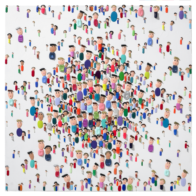 김소형 작가는 캔버스 빼곡히 시그니처인 인간 군상을 넣은 작업을 통해 '행복론'을 이야기합니다. 작품은 마치 패턴으로 표현한 추상화처럼 보이지만 가까이서 보면 각기 다른 각양각색의 사람들이 채워져 있으며, 캔버스에 물감 덩어리를 짜내어 붙이는 작업방식 때문에 한 작품의 완성에 수개월까지 걸리기도 하지만, 이제 작가의 인기 시그니처가 되었습니다. 작가는 '사람들은 혼자서는 살 수 없고, 함께할 때 진정한 행복을 느낀다'며 작품이 위로가 되기를 희망합니다.