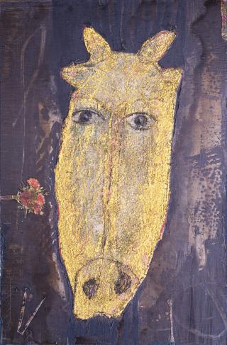 “유년시절 나는 항상 시골언덕 위에서 풀을 뜯고 있는 소와 겹쳐진다. 꼴을 베다 잠시 쉴 때도, 엄마가 그리워 나무 아래에 앉아 남몰래 눈물을 훔칠 때도 소는 내 옆에 있었다. 이처럼 소는 고향에 대한 그리움이고 마음의 위안을 주는 친구였기에 다양한 모습으로 소를 시각화하여 사람과 공존하며 평화롭게 살아가는 모습을 그리고 싶었다. 작품은 흙벽을 재현하여 어떤 삶의 흔적과 순수한 세계가 그대로 옮겨진 것 같이 표현하였다.”