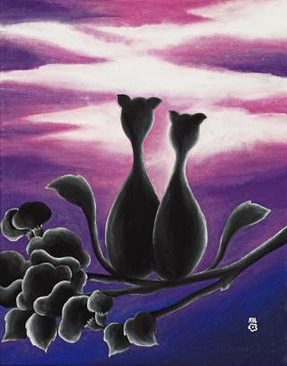 작가는 능소화와 나비를 전통채색방식에 현대적인 조형성으로 표현하여 사랑, 만남, 이별의 여정을 펼칩니다. 능소화는 사랑을 이루지 못한 여인이 상대에 대한 그리움으로 붉게 피어났다는 설화를 가지고 있는데 작품에서도 능소화는 아주 화려하고 만개한 모습으로 등장하고 있어 슬픈 감정을 던져 줍니다. 다양한 색채로 드러나는 나비들은 서로 만나 교감하는 장면과 흩어져서 이별하는 장면으로 묘사되어 삶과 사랑에 대한 작가의 진지한 탐색이 드러납니다.