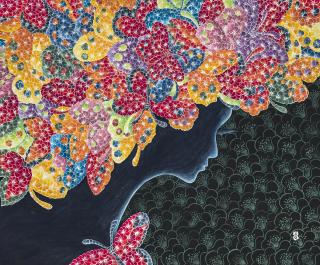 작가는 능소화와 나비를 전통채색방식에 현대적인 조형성으로 표현하여 사랑, 만남, 이별의 여정을 펼칩니다. 능소화는 사랑을 이루지 못한 여인이 상대에 대한 그리움으로 붉게 피어났다는 설화를 가지고 있는데 작품에서도 능소화는 아주 화려하고 만개한 모습으로 등장하고 있어 슬픈 감정을 던져 줍니다. 다양한 색채로 드러나는 나비들은 서로 만나 교감하는 장면과 흩어져서 이별하는 장면으로 묘사되어 삶과 사랑에 대한 작가의 진지한 탐색이 드러납니다.