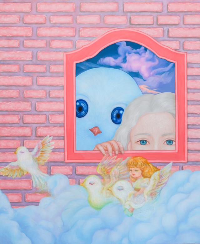 작가는 동화나 신화 속 이미지, 탄생화 등을 차용하여 꿈이나 환상에 대한 그림을 그립니다. 그림은 모두 가느다란 선으로 그립니다. 선을 한 가닥씩 살펴보면 약해보이지만, 이들은 겹쳐지고 겹쳐져서 견고한 면을 만들어냅니다. 연약한 선을 모아 견고한 면을 만들어 냈듯이 그림이 관람자들에게 위안을 주고 부드럽게 감싸주는 환상의 세계가 되기를 바랍니다.