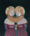 작품 속 주인공은 꼬마 소녀부터 성숙한 여인까지 다양한 나이대로 표현된 작가 자신의 모습입니다. 작가는 어릴 적 기억에서 이끌어낸 자아를 이미지화하고 현재시점의 생각과 감정을 가미합니다. 추억이 깃든 사진첩을 꺼내보면서 잊었던 과거의 추억을 회상하거나, 잠재의식 속에 있는 자아를 작품 속으로 끌어내어 초현실적인 요소들도 등장시킵니다. 두 소녀가 등장하는 작품은 과거와 현재의 자아가 조우하거나 주관적 자아가 타자화된 자아를 바라보는 모습입니다.