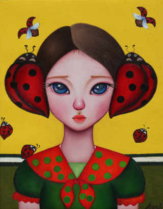 작품 속 주인공은 꼬마 소녀부터 성숙한 여인까지 다양한 나이대로 표현된 작가 자신의 모습입니다. 작가는 어릴 적 기억에서 이끌어낸 자아를 이미지화하고 현재시점의 생각과 감정을 가미합니다. 추억이 깃든 사진첩을 꺼내보면서 잊었던 과거의 추억을 회상하거나, 잠재의식 속에 있는 자아를 작품 속으로 끌어내어 초현실적인 요소들도 등장시킵니다. 두 소녀가 등장하는 작품은 과거와 현재의 자아가 조우하거나 주관적 자아가 타자화된 자아를 바라보는 모습입니다.