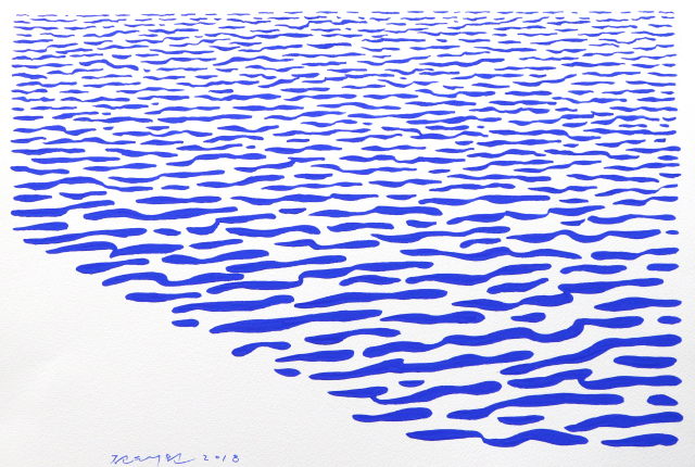 작가는 시간의 흐름과 그에 따른 역사의 축적을 물결이미지로 표현합니다. 문명의 흔적이 담긴 인쇄물은 방대한 인류 이야기의 오브제가 되어 끊임없는 연속과 과정의 물결이 되었습니다. 동심원의 물결무늬에서부터 유유히 흘러가는 물결, 영하의 온도가 느껴지는 무겁고 날카로운 물결이 있는가하면 물결이 모래바닥을 훑고 지나간 듯한 모양까지, 작가는 이러한 다채로운 표현에서 이 시대 사람들이 잠시나마 영겁의 편린(片鱗)을 보고 느껴준다면 그것으로 만족한다고 말합니다.