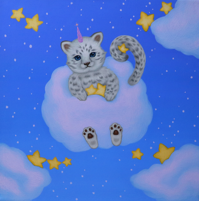 작가는 동화나 신화 속 이미지, 탄생화 등을 차용하여 꿈이나 환상에 대한 그림을 그립니다. 그림은 모두 가느다란 선으로 그립니다. 선을 한 가닥씩 살펴보면 약해보이지만, 이들은 겹쳐지고 겹쳐져서 견고한 면을 만들어냅니다. 연약한 선을 모아 견고한 면을 만들어 냈듯이 그림이 관람자들에게 위안을 주고 부드럽게 감싸주는 환상의 세계가 되기를 바랍니다.