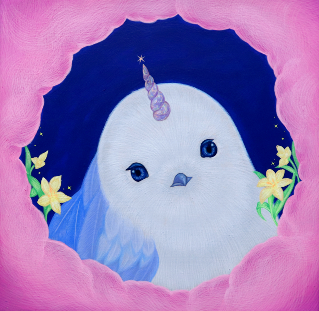 작가는 동화나 신화 속 이미지, 탄생화 등을 차용하여 꿈이나 환상에 대한 그림을 그립니다. 그림은 모두 가느다란 선으로 그립니다. 선을 한 가닥씩 살펴보면 약해보이지만, 이들은 겹쳐지고 겹쳐져서 견고한 면을 만들어냅니다. 연약한 선을 모아 견고한 면을 만들어 냈듯이 그림이 관람자들에게 위안을 주고 부드럽게 감싸주는 환상의 세계가 되기를 바랍니다.