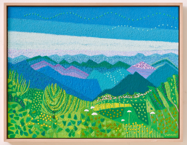 '흐르는 산'을 그리는 김윤숙 작가는 눈에 보여지기 위한 것이 아닌 내면의 세계를 표출해내며 산의 포근함과 신비로움을 화폭에 담아내고 있다. 작품은 단순화되거나 다양한 색채와 압축된 이미지로 변형, 재해석하고 있다. 물감에 돌가루가 섞여 중첩되고 두터워지는 것은 산에 대한 즐거움과 반가움, 경외하는 마음이 녹아 들어가는 과정이다. '거대하고 위대한 자연. 언제든 가기만 하면 품어주고 위로해주며 멀리서도 항상 손짓하는 산. 나에게는 영원한 예술의 화두다.