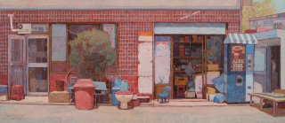 이 작품은 오래된 동네 이발소를 정교하게 그린 사실주의적 회화로, 친근하고 정감 있는 한국의 일상 풍경을 담고 있습니다. 작품 속 이발소는 작은 화분과 세월의 흔적이 담긴 간판, 창문에 비친 내부가 특징적으로 표현되며, 작가는 붓 터치와 색채의 세밀함을 통해 장소의 온기와 정서를 생생히 전달합니다. 화면 곳곳에 배치된 사물들은 무심히 놓인 듯하면서도 조화를 이루며, 바버폴(회전식 이발소 기둥)이 화면의 시선을 끌며 이발소 특유의 상징성을 강조합니다.