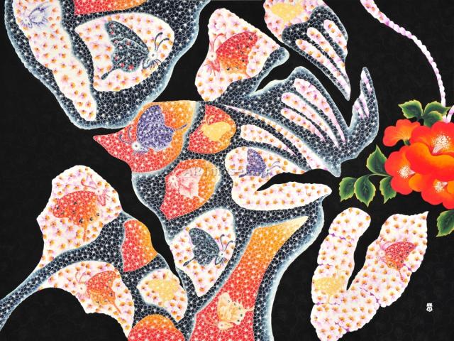 작가는 능소화와 나비를 전통채색방식에 현대적인 조형성으로 표현하여 사랑, 만남, 이별의 여정을 펼칩니다. 능소화는 사랑을 이루지 못한 여인이 상대에 대한 그리움으로 붉게 피어났다는 설화를 가지고 있는데 작품에서도 능소화는 아주 화려하고 만개한 모습으로 등장하고 있어 슬픈 감정을 던져 줍니다. 다양한 색채로 드러나는 나비들은 서로 만나 교감하는 장면과 흩어져서 이별하는 장면으로 묘사되어 삶과 사랑에 대한 작가의 진지한 탐색이 드러납니다.